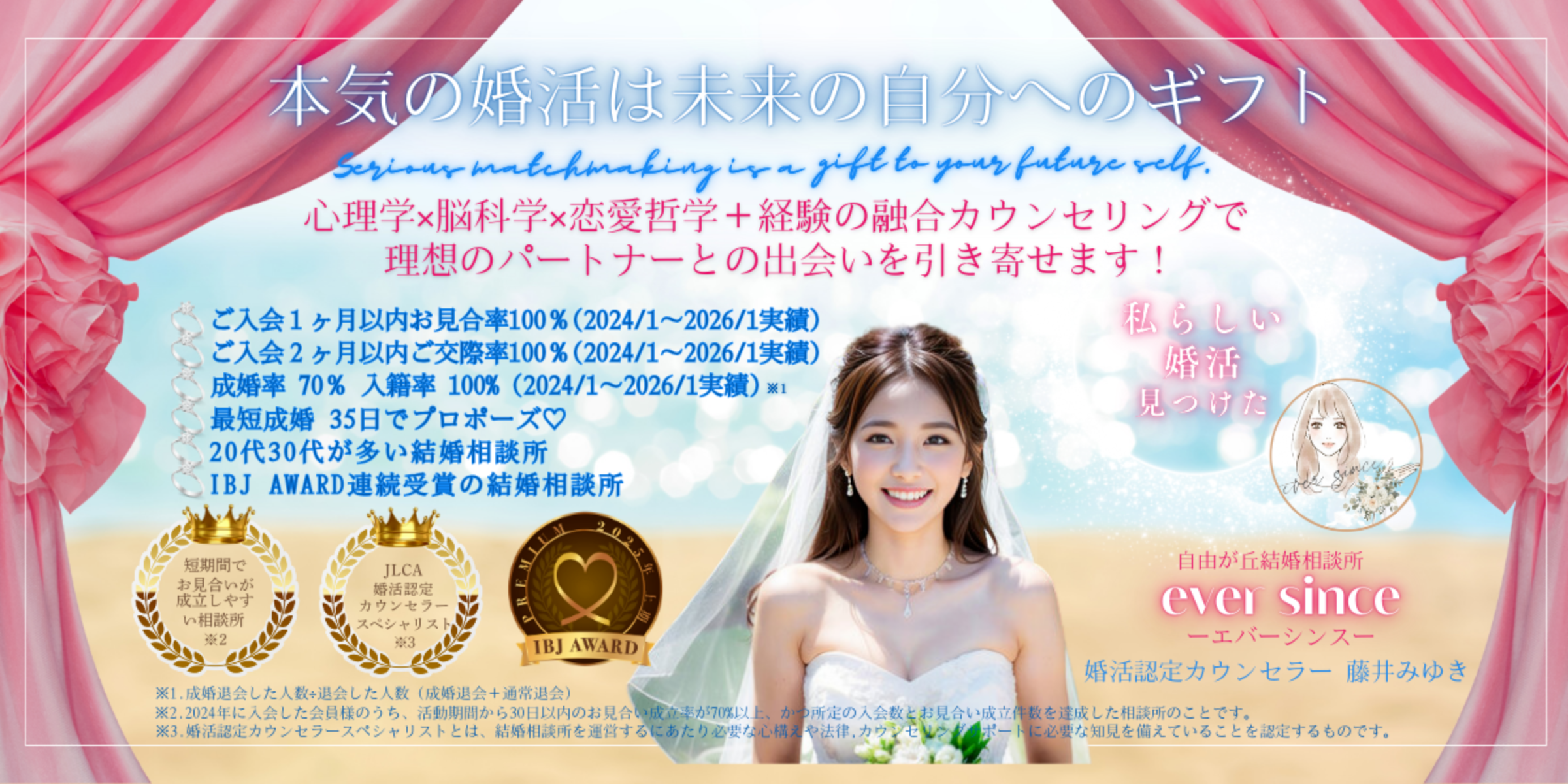 そして結婚はゴールではありません。ever sinceは「その後ずっと」という意味です。これから長く続く良縁であることを祈って先ずはあなたを理想の一年後に導いてまいります。